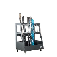 Ski Collect is a mobile service rack designed for transporting larger volumes of ski equipment. Its base is mounted on four swivel casters with integrated brakes, providing stability as well as safe and convenient positioning. Both sides of the structure feature elongated, ergonomic handles that enable precise handling of the rack. The interior is lined with a durable rubber mat, while the full width of the rear section is equipped with aluminium support crossbars fitted with rubber seals positioned at two heights. This system ensures secure, scratch-free support for skis and snowboards, accommodating both junior and senior models. The set also includes galvanised, corrosion-resistant divider arms that can be mounted at any spacing across the rack’s width, allowing flexible separation of different categories of equipment according to current needs. With its well-engineered construction and high functional performance, the rack is an excellent solution for larger rental shops and service centres, improving workflow and overall organisation of ski equipment.