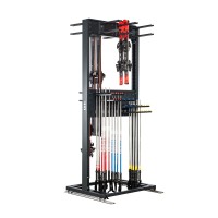 Stelaż składa się z takich elementów jak rama, kolumny, dwa poziomy i widły. Dostępne są dwa rodzaje poziomów. Pierwszy z nich przeznaczony jest do przechowywania widełek do nart, natomiast bardziej złożona konstrukcja drugiego typu umożliwia przechowywanie kijków narciarskich. Każdy widelec na narty jest pokryty specjalną antypoślizgową farbą gumową i może pomieścić do trzech par nart. Widelce na kijki mają postać specjalnie zaprojektowanych dwóch stalowych ramion, pomiędzy którymi można przechowywać do czterech par kijków. Poziome poziomy o regulowanej wysokości umożliwiają przechowywanie nart i kijków o różnych rozmiarach oraz dają możliwość dowolnego rozmieszczenia widelców na poziomach, co przekłada się na wyjątkową funkcjonalność i pojemność tego bagażnika.